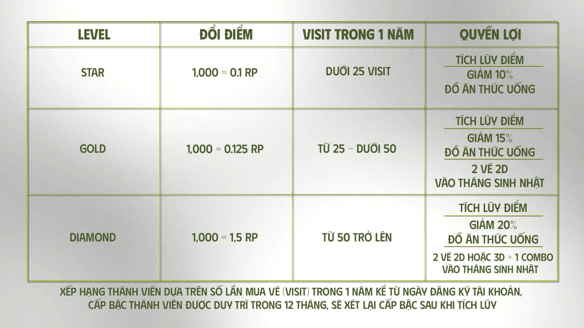 • Khách hàng thành viên phải xuất trình tài khoản thành viên trước khi thanh toán tại quầy vé và đồ ăn thức uống để được tích điểm.