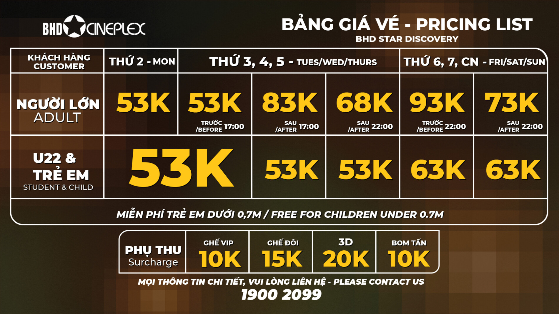 – Giá vé trẻ em áp dụng cho trẻ em có chiều cao dưới 1,3m. Yêu cầu trẻ em có mặt khi mua vé. Trẻ em dưới 0,7m sẽ được miễn phí vé khi mua cùng 01 vé người lớn đi kèm theo. Không áp dụng kèm với chương trình khuyến mãi ưu đãi về giá vé khác.