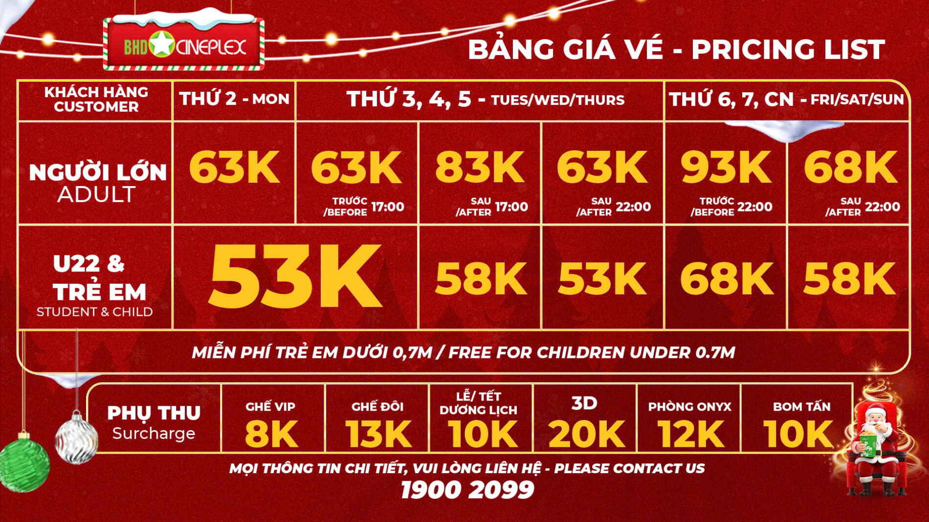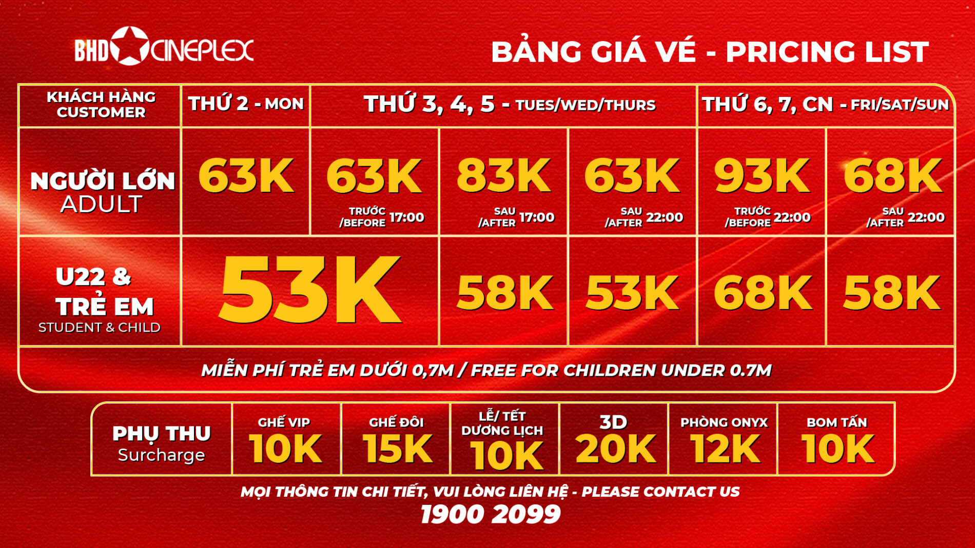 – Suất chiếu đặc biệt áp dụng giá vé theo khung giờ của ngày. Không áp dụng các giá vé ưu đãi dành cho Privilege Voucher/ Staff Voucher, Happy Day. Trong trường hợp Suất chiếu đặc biệt cùng ngày với Happy Day sẽ áp dụng giá vé của Thứ 3.