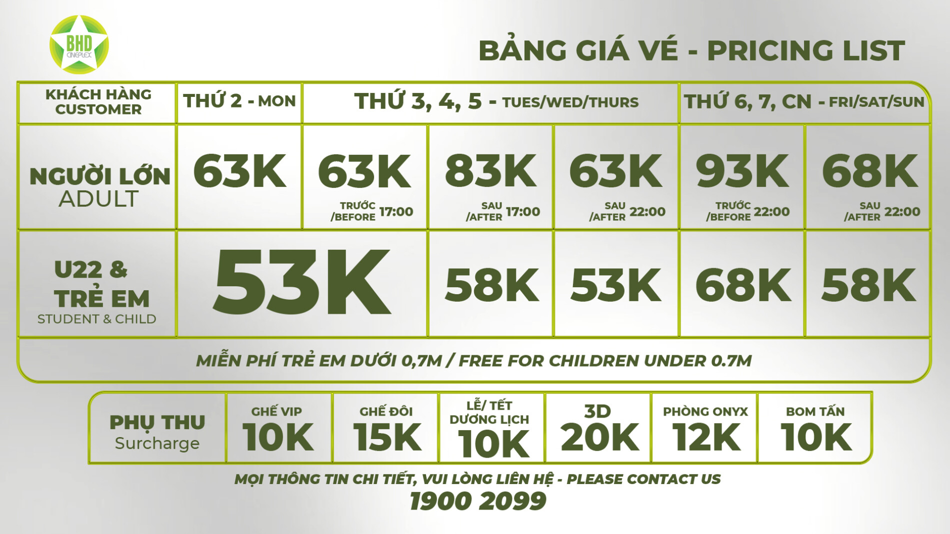 – Suất chiếu đặc biệt áp dụng giá vé theo khung giờ của ngày. Không áp dụng các giá vé ưu đãi dành cho  Privilege Voucher/ Staff Voucher, Happy Day. Trong trường hợp Suất chiếu đặc biệt cùng ngày với Happy Day sẽ áp dụng giá vé của Thứ 3.