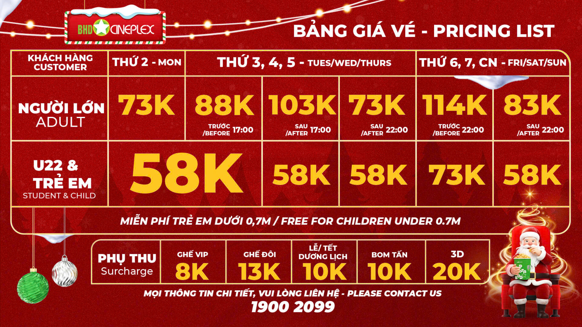– Suất chiếu đặc biệt áp dụng giá vé theo khung giờ của ngày. Không áp dụng các giá vé ưu đãi dành cho Privilege Voucher/ Staff Voucher, Happy Day. Trong trường hợp Suất chiếu đặc biệt cùng ngày với Happy Day sẽ áp dụng giá vé của Thứ 3.